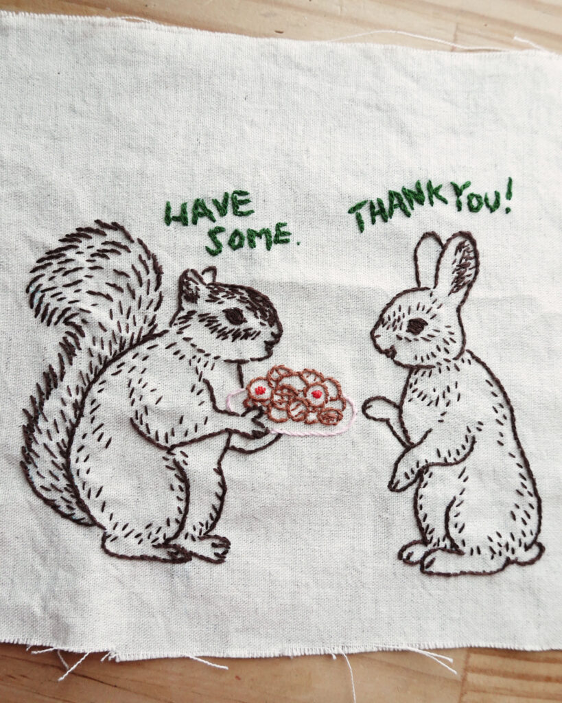 「お手製クッキーをすすめるリスさん」刺繍作品の記録