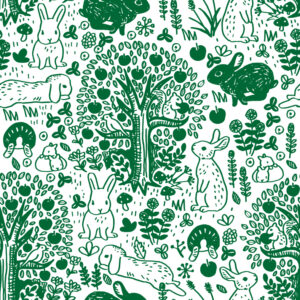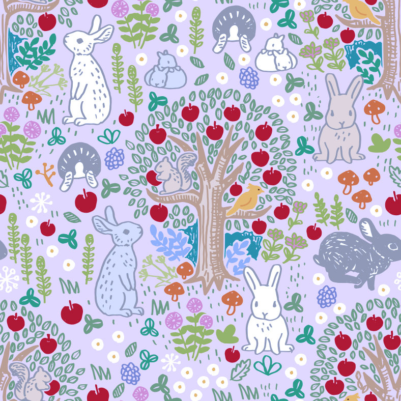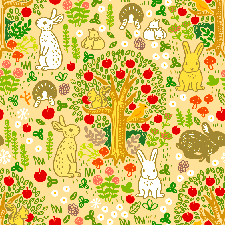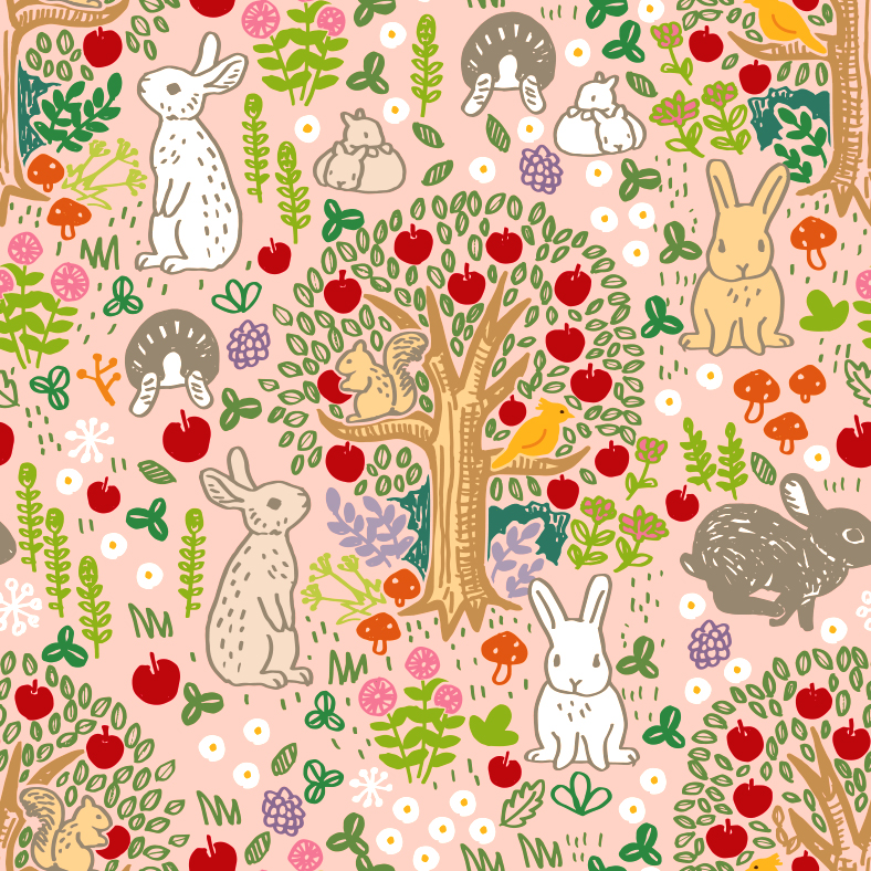 うさぎさんたちが思い思いに過ごしている様子を、模様として描いています。